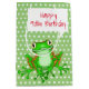 Cute grönt grog på mjuk grönt och vit polka punktbakgrund med tal bubbla för 90:e födelsedag. Text kan redigeras.