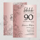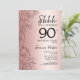 Ro Guld överraskar 90:e Födelsedagsfest inbjudan. Glam femininin-design med botaniska accenter och typsnitt för typsnitt. Enkel perfekt för inbjudan-kort i blommigt för en snyggt kvinnlig överraskning i firande. Kan anpassas till vilken ålder som helst. Utskriven Zazzle-inbjudan eller digital mall för omedelbar nedladdning.
