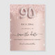 Ett giftigt och trendig Spara datumkortet för en 90:e födelsedagsfest. Ro guld övertoningsbakgrund som dekoreras med droppar och stoft från ro guld och faux silver glitter. Anpassa och lägg till datum och namn/text. Texten: Spara datumet skrivs med ett stort trendig-handskript i stil med dekortecken. Nummer 90 med ett stil-teckensnitt med ballong.