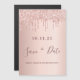 Ett giftigt och trendig Spara datumkortet för en 90:e födelsedagsfest. En feminin rosa, ro guld-bakgrund som dekoreras med ro guld droppar. Mallar för ett datum och namn/ålder 90. Mörk ro guld färgad brev. Texten: Spara datumet skrivs med ett stort trendig-handskript i stil.
