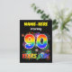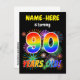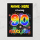 Framsidan av denna roligt och den sjudande födelsedagsfest inbjudan-vykortsutformningen har en personlig namn, ett livligt brinnande berömmande fyrverkerier inspirerade mönster och meddelandet "90 ÅRS OLD!" med ett färgstarkt regnbågsspektrum inspirerat till övertoning mönster. Baksidan innehåller ett anpassade som kan beskriva när och var party hålls, utöver annan relevant information. Bjuda in vykort som detta kan skickas till potentiella deltagare i ett party som hålls för att fira födelsedagen för någon som blir 90 år gammal. [~Z0000452]