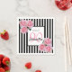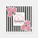 En napkin för en 90:e födelsedagsfest. Klassiskt smalt svart och vitt lodrät rand som bakgrund. Med giftigt och feminin rosa ros som dekoration. Ett vitt och rosa ram på framsidan med mall för ålder, namn och datum. Ålder 90 i rosa, namn och datum i svart. Namn är skrivet med ett handskript i stil.