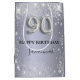Elegant, klassisk, glamorös 90:e födelsedagsfest. En metallisk bakgrund i silver. Dekorerad med damm från glitter. Anpassa och lägg till ett namn. Med texten: Grattis på födelsedagen. Namn är skrivet med ett modernt handskript i stil. Nummer 90 skrivs med ett stil-teckensnitt med ballong.