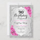 90:e födelsedagsinbjudan. Elegantens utformning i silver och rosa. Funktioner faux glitter silver rand, rosa ros snyggt, skriptteckensnitt och konetti. Perfekt för en glam-födelsedagsfest.