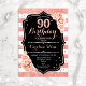 90:e födelsedagsinbjudan till kvinnor. Elegant ro guld, vit och svart design med faux glitter. Funktioner rand, rosa ros, skriptteckensnitt och konetti. Perfekt för en snyggt, milstolpe på födelsedagskalender.