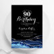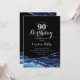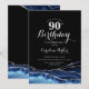 marinblått, svart och silver agerade 90:e födelsedagsfest inbjudan. Elegantens moderna utformning med royal blue water agate marble geode-bakgrund, faux glitter silver och typography-skript. Trendig inbjudan-kortets perfekt för en snyggt kvinnor i firande. Skrivna Zazzle-inbjudningar eller digital utskrivbar mall för omedelbar nedladdning.