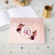 En gäst Bok för en 90:e födelsedagsfest. En gyllene och övertoningsbakgrund för rosa med en geometrisk ram för faux guld. Dekorerad med mörkens lila och burgundblommor, ro och boho stil fjädrar. Ro guld droppar, målardropp på framsidan och baksidan. Mallar för namn, 90 år och ett datum. Födelsedatum eller datum för party. Namn är skrivet med ett handskript i stil, rosa färgad brev, ålder i lila och datum med svarta siffror. Lägg till texten på ryggraden.