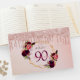 En gäst Bok för en 90:e födelsedagsfest. En gyllene och övertoningsbakgrund för rosa med en geometrisk ram för faux guld. Dekorerad med mörkens lila och burgundblommor, ro och boho stil fjädrar. Ro guld droppar, målardropp på framsidan och baksidan. Mallar för namn, 90 år och ett datum. Födelsedatum eller datum för party. Namn är skrivet med ett handskript i stil, rosa färgad brev, ålder i lila och datum med svarta siffror. Lägg till texten på ryggraden.