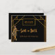 Elegant faux guld och glam för en 90:e födelsedagsfest! Födelsedagsfesten Art deco stil Spara datumkortet i faux guld och svart för en glamorös firande. Dekorerad med 1920 års stil flapper-flicka och konst deco stil ram. Mallar för ett datum och namn/ålder. Det här kortet finns också i vår butik med vit bakgrund färg på baksidan. Tips! Om du inte vill att det ska se ut som ett vykort klickar du på anpassa, går till baksidan och tar bort delaren och lägger till frimärke.