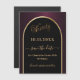 Ett magnetsparande av datumkortet för en 90:e födelsedagsfest. En svart och burgundisk bakgrund, dekorerad med faux guld arch. Anpassa och lägg till ett datum och ditt namn. Texten: 90 och Spara datumet skrivs med ett stort trendig-handskript i stil.