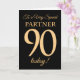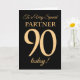 Ett 90:e födelsedagskort i chic för en "mycket Speciell partner", med nummer 90 bestående av guld-effektnummer och ord "partner" i guld-effekt på svart bakgrund. Det inre budskapet, som man kan ändra om man vill, är "Grattis på födelsedagen"