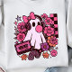 Denna #ghostgirl-design blandar #90saesthetic-nostalgi med lekfull Halloween-karism. En söt bubbelgummi-blåsande spöke bär överdimensionerade hörlurar och en rosett, omgiven av #floralart-stjärnor, rutmönstrade accenter och retrofavoriter som en #mixtape-kassett och glad smiley. Det är en perfekt blandning av kusligt och sött.