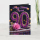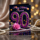 Celebrate a magnificent milestone with this luxurious 90th Birthday card, designed to make her feel like the gem she is. The front design features the number "90" elaborately crafted in faux purple amethyst gemstones and gold encasing, accompanied by a soft pink rose with gold filigree leaves and a classic strand of pearls. Set against a deep black background with glowing bokeh lights, this design exudes elegance and glamour.