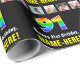 Den här djärva och öga-infångande födelsedagskalemat som omsluter papper design har ett stort nummer "91" med ett dynamiskt multifärgat regnbågsspektrum som inspirerar gradienten mönster, tillsammans med meddelandet "Lycklig 91:a födelsedagen" och en redigerbar mottagare namn. Det finns även foton som kan vara personlig, kanske med foton av mottagaren, mottagarens familj och vänner och/eller presentens avsändare. Uppslag på födelsedagskalans pappra inslagning kan användas när en gåva eller present i firande på någons nittioförsta födelsedag är ge. (Photography © Storytree Studios, Stanford, CA.) [~Z0000670]