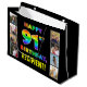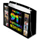 Den här glatta och roliga presentsäcksdesignen för födelsedagspressar innehåller meddelandet "LYCKLIG 91ST BIRTHDAY", med ett dynamiskt, flerfärgat regnbågsspektrum som inspirerar övertoningen mönster, tillsammans med en anpassningsbar som tar emot namn. Fotografierna till lämnat och högerna av det regnbågsmönstrade meddelandet på kortets framsida kan vara personlig, kanske med foton av mottagaren, mottagarens familj och vänner och/eller presentens avsändare. En presentpåse som denna kan användas när man slår in gåvor eller presenter som ges till någon i firande på 91-årsdagen. (Photography © Storytree Studios, Stanford, CA.) [~Z0000668]