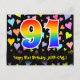 Den främre delen av denna spännande, roliga och färgglada födelsedagskortdesign har en stor siffra "91" med ett regnbågsspektrum-gradering-mönster, tillsammans med meddelandet "Grattis på 91-årsdagen," och ett anpassat mottagarnamn. Framsidan har dessutom ett livfullt och färgglatt mönster av kärleksfulla hjärtformer. Baksidan har ett redigerbart födelsedagsmeddelande, eller kanske kan rensas och lämnas tomt om ett meddelande ska skrivas för hand istället. Ett anpassningsbart födelsedagskort som detta kan vara ett roligt sätt att erkänna någon på deras 91-årsdag. Postkort som detta kan också användas för att inbjuda gäster till en födelsedagsfest som hålls för någon som fyller 91 år.