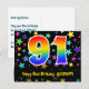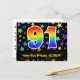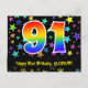 Den främre delen av denna roliga, färgglada och spännande födelsedagstema postkortsdesign har ett stort nummer "91" med ett regnbågsspektrum-gradering inspirerat mönster. Den har också meddelandet "Grattis på 91-årsdagen," och ett redigerbart mottagarnamn. Framsidan har dessutom ett livfullt och färgglatt stjärnformigt bakgrundsmönster. Baksidan har ett redigerbart födelsedagsmeddelande, eller kan rensas och lämnas tomt om ett meddelande ska skrivas för hand istället. Ett personligt födelsedagskort som detta kan vara ett roligt sätt att uppmärksamma någon på deras 91-årsdag. Postkort som detta kan också användas för att inbjuda gäster till en födelsedagsfest eller firande som hålls för någon som