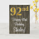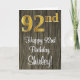 Denna lyxiga, sofistikerade och högtidliga gratulationskort för snyggten har ett stort ordnummer "92:a" med en imitation/faux guld-liknande gradient mönster, tillsammans med hälsning-födelsedagstecknet "Lycklig 92:a födelsedag" och en personlig namn i ett skript-stil på framsidan. Bakgrunden till framsidan har ett faux wood-inspirerat mönster. Insidan har ett anpassat hälsning-födelsedagsmeddelande, eller så kan det kanske rensas och lämnas tomt om ett meddelande ska skrivas för hand i stället. Ett sådant anpassat födelsedagskalenderkort kan användas för att bekräfta någons nittiosekundersfödelsedag. [~Z0000519]