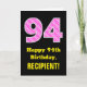 Den här glatta och roligt-födelsedagskalan med hälsningskortet har ett stort nummer "94" som har en mönster som innehåller skarpa hjärtformer och som är ljus rosa på framsidan av färgadens mörk och rosa. På framsidan finns också hälsning:s födelsedagsmeddelande "Lycklig 94:e födelsedag", och en personlig mottagare av namn. Insidan innehåller ett hälsning-meddelande från anpassadets födelsedag, eller kan kanske tas bort och lämnas tomt om ett meddelande ska skrivas för hand i stället. Ett sådant här födelsedagskort i anpassadet kan vara ett roligt för att erkänna någons nittiofjärde födelsedag. Det kan också vara ett val av roligt för någon vars födelsedag infaller på Alla hjärtans dag (14 februari), på grund av dess kärleksfulla hjärtsymboler och färg. [~Z0000434]