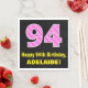 Den här roligten och den glatta födelsedagen har den pappra napkin-designen ett stort nummer "94" med en mörk rosa och ljusa rosa stripade mönster som innehåller hjärtformer. Det innehåller också hälsning:s födelsedagsmeddelande "Lycklig 94:e födelsedag" och ett anpassade namn. Pappra servetter som denna kan vara trevliga att ha på en party som hålls för att fira någons 94-årsdag. Det kan också vara en roligt för någon vars födelsedag infaller på Alla hjärtans dag (14 februari) på grund av dess kärleksfulla hjärtsymboler och färg. [~Z0000436]