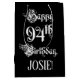 Den här opulenta och ornerade presentsäcksdesignen för födelsedagspressar innehåller meddelandet "Lycklig 94:e födelsedagen" i finare-skriptet stil, på en svart färgad. Det har också en anpassningsbar som tar emot namn. En sådan här formell födelsedagsäck kan vara ett respektabelt sätt att figurera en gåva eller present som ges till någon som firar sin 94-årsdag. [~Z0000557]