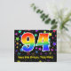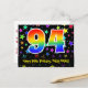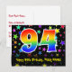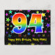 Framsidan av denna roliga, färgglada och spännande födelsedagskortdesign har en stor siffra "94" med ett regnbågsspektrum-gradering-mönster. Den har också meddelandet "Grattis på 94-årsdagen," och ett anpassat mottagarnamn. Framsidan har dessutom en livlig och färgrik bakgrund med ett mönster av stjärnformer. Baksidan har ett anpassningsbart födelsedagsmeddelande, eller kan rensas och lämnas tomt om ett meddelande ska skrivas för hand istället. Ett personligt födelsedagskort som detta kan vara ett roligt sätt att skicka ett meddelande för att fira någon som fyller 94 år. Postkort som detta kan också användas för att inbjuda gäster till en födelsedagsfest eller kalas som hålls för någon som fyll