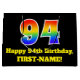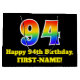 Denna pulserande och roligt födelsedagspressformgivning har ett stort nummer "94" med en regnbågsspektrumövertoning som inspirerat mönster. Det innehåller också budskapet "94:e födelsedagen i Lycklig" och ett anpassade namn. Den har också en bakgrund med svart färgad. En färgfull presentsäck som denna kan användas när en gåva eller present är ge för att hedra någons nittiofjärde födelsedag. [~Z0000521]