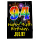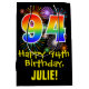 Den spännande, roligt och färgstarka presentsäcksdesignen med födelsedagstext har ett stort nummer "94" med en regnbågsspektrumövertoning som inspirerade mönster, tillsammans med budskapet "94:e födelsedagen i Lycklig", och en anpassade som tar emot namn. Det har också en färgstark, brinnande, berömmande fyrverkerier som inspirerat mönster. En roligt presentsäck av det här slaget kan användas när man slår in presenter som ges till någon i firande på 94-årsdagen. [~Z0000509]