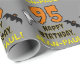 Den här skrämmande och läskiga Halloween-födelsedagskalans tematiska omslutning av papper design har ett stort nummer "95" och meddelandet "GRATTIS PÅ FÖDELSEDAGEN,", plus ett eget namn. Det finns också bilder av ett spöke och ett fladdermus på framsidan. Att packa pappert på detta sätt kan vara ett roligt för att packa presenter eller gåvor som ges till någon vars 95-årsdag infaller på Oktober 31a (Halloween). [~Z0000411]