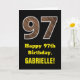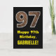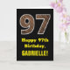 Den här rustika och roliga födelsedagskortdesignen har en stor siffra "97" med ett stil-mönster inspirerat av imiterad trästruktur på framsidan. Framsidan har också födelsedagsmeddelandet "Grattis på 97-årsdagen," och ett anpassningsbart namn på mottagaren. Insidan har ett redigerbart födelsedagsmeddelande, eller kanske kan det rensas och lämnas tomt om ett meddelande ska skrivas för hand istället. Ett personligt födelsedagskort som detta kan vara ett roligt sätt att skicka födelsedagsönskningar till någon som firar sin nittiosjunde födelsedag. [~Z0000433]
