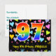 Framsidan av denna kärleksfulla, färgglada och spännande födelsedagskortdesign har en stor siffra "97" med ett regnbågsspektrum-gradering-mönster. Den har också meddelandet "Grattis på 97-årsdagen," och ett personligt mottagarnamn. Framsidan har dessutom ett färgglatt och livfullt kärleksfullt hjärtans bakgrundsmönster. Baksidan har ett personligt födelsedagsgratulationsmeddelande, eller kanske kan lämnas tom om ett meddelande ska skrivas för hand istället. Ett personligt födelsedagskort som detta kan vara ett roligt sätt att erkänna någon på deras nittiosjunde födelsedag. Postkort som detta kan också användas för att inbjuda gäster till en födelsedagsfest som hålls för någon som fyller