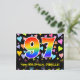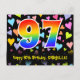 Framsidan av denna kärleksfulla, färgglada och spännande födelsedagskortdesign har en stor siffra "97" med ett regnbågsspektrum-gradering-mönster. Den har också meddelandet "Grattis på 97-årsdagen" och en personlig mottagares namn. Framsidan har dessutom ett färgglatt och livfullt kärleksfullt hjärtmönster i bakgrunden. Baksidan har ett personligt födelsedagsgratulationsmeddelande, eller kan kanske rensas och lämnas tomt om ett meddelande ska skrivas för hand istället. Ett personligt födelsedagskort som detta kan vara ett roligt sätt att erkänna någon på deras nittiosjunde födelsedag. Postkort som detta kan också användas för att inbjuda gäster till en födelsedagsfest som hålls för