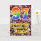 Framsidan av denna färgglada, rustika och naturinspirerade födelsedagskortsdesign har en stor siffra "97" med ett mönster inspirerat av regnbågens spektrumgradient, tillsammans med meddelandet "Grattis på 97-årsdagen," och ett personligt namn. Baksidan av framsidan på kortet har ett rustikt mönster med nedfallna höstlöv. Insidan har ett anpassat födelsedagsmeddelande, eller kanske kan lämnas tom om ett meddelande ska skrivas för hand istället. Ett personligt födelsedagskort som detta kan vara ett roligt sätt att skicka födelsedagsönskningar till någon som firar sin nittiosjunde födelsedag.