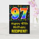 Framsidan av den här roligten, den robusta och färglösa födelseteckendesignen har ett stort nummer "97" med en regnbågsspektrumövertoning som inspirerade mönster, tillsammans med meddelandet "Lycklig 97:e födelsedag", och anpassadet namn. På framsidan finns också en mönster med olika musik noter och symboler med olika färg och storlekar. Insidan innehåller ett anpassat hälsning-födelsedagsmeddelande eller kan kanske tas bort och lämnas tomt om ett meddelande ska skrivas för hand i stället. Ett sådant här födelsedagskort i personligen kan vara ett roligt för att skicka önskemål till en musiker, sångare, kompositör eller någon annan som firar sin nittiosjunde födelsedag. [~Z0000420]