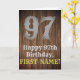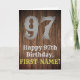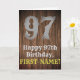 Det här land-utseendet och den westerna utseendet på gratulationskortet med födelsedag har ett stort, inspirerat nummer "97", meddelandet "Lycklig 97:e födelsedag", ett redigerbart namn, och ett faux-/imiterat träkorn inspirerade stil mönster. Insidan har ett hälsning-meddelande på anpassningsbarnas födelsedag, eller kan kanske tas bort och lämnas tomt om ett meddelande ska skrivas för hand i stället. Ett anpassat födelsedag som detta kan vara ett roligt sätt att ge födelsedagseftergifter till någon som firar sin nittiosjunde födelsedag. [~Z0000469]