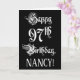På framsidan av denna lavish- och finare-födelsedag, som kallas hälsningskort, finns meddelandet "Lycklig 97:e födelsedag," i det formella skriptet stil, på en svart färgads bakgrund. Insidan har ett anpassat hälsning-födelsedagsmeddelande, eller så kan det kanske rensas och lämnas tomt om ett meddelande ska skrivas för hand i stället. Ett portionerat hälsningskort för anpassadets födelsedag som detta kan användas för att fira någons nittiosjunde födelsedag. [~Z0000554]
