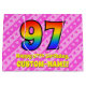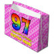 Den här sjuttonde presentsäcksdesignen, som är ett fräckt och glädjande 97-årsjubileum, har ett stort nummer "97" med ett regnbågsspektrum som inspirerar gradienten mönster. Det innehåller också budskapet "97:e födelsedagen i Lycklig" och ett anpassade namn. Bakgrunden har en ljus rosa och mörk rosa rand mönster som innehåller levande hjärtformer av rosa. Sådana presentsäckar kan användas när man slår in presenter eller ger gåvor till någon som firar sin nittiosjunde födelsedag. [~Z0000414]