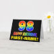 Framsidan av den här roligten, glad och färglös gratulationskortsdesign för födelsedag har ett stort nummer "98" och meddelandet "GRATTIS PÅ FÖDELSEDAGEN", som båda har en regnbågsspektrumövertoning som inspirerade mönster-färgning, tillsammans med en fet gult anpassade mottagare namn. På framsidan finns också en enkel bakgrund för svart färgad. Insidan har ett hälsning-meddelande från anpassadets födelsedag, eller kan kanske rensas och lämnas tomt om ett meddelande ska skrivas för hand i stället. Ett sådant här muntert födelsedagskort i anpassadet kan vara ett roligt sätt att skicka ett meddelande om att fira någons nittioåttonde födelsedag. [~Z0000472]