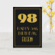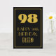 Framsidan av den här stil-födelsematematiska hälsningskortet i vintage har ett stort konsdeco-utseende som inspirerat nummer "98", meddelandet "LYCKLIG 98:e BIRTHDAY", en personlig namn och en gräns mönster som består av linjer. Det finns en bakgrund med svart färgad på framsidan. Insidan innehåller ett redigerbart hälsning-födelsedagsmeddelande, eller så kan det kanske rensas och lämnas tomt om ett meddelande ska skrivas för hand i stället. Ett sådant här födelsedagskort i anpassadet kan vara ett roligt sätt att skicka önskemål till någon som firar sin nittioåttonde födelsedag. [~Z0000502]