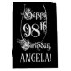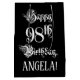 Den här lavande och utförliga presentsäcksdesignen för födelsedagspresent innehåller meddelandet "98:e födelsedagen Lycklig" i stil, i skript, på en svart färgad. Det har också en anpassningsbar som tar emot namn. En dylik presentpåse på födelsedagen kan användas när en gåva eller present i firande av någons nittioåttonde födelsedag är ge. [~Z0000557]