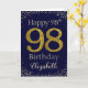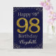 Grattis på födelsedagen-kort med ett simulerat glitter-stil-nummer 98 inställt på ett fast färg med faux-rineston-omgivning. Detta kort kan vara personlig med mottagarna namn på framsidan och insidan av kortet.