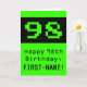 Utformningen av hälsningskortet på den här roligten och den här genterapiven har en stor grönt för datorspel stil nummer "98". Det innehåller också hälsning:s födelsedagsmeddelande "Lycklig 98:e födelsedag" och ett namn som kan redigeras. Insidan innehåller ett hälsning-meddelande från personligens födelsedag, eller kan kanske tas bort och lämnas tomt om ett meddelande ska skrivas för hand i stället. Ett hälsningskort för fånig och hög födelsedagstid som detta kan användas för att skicka önskemål till en datorhistoriker, en datorprogrammerare eller någon som gillar klassiska dataspel och som firar sin nittioåttonde födelsedag. [~Z0000430]