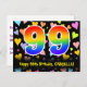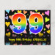 Framsidan av denna kärleksfulla, roliga och spännande födelsedagskortdesign har en stor siffra "99" med ett regnbågsspektrum-gradering-mönster. Den har också meddelandet "Grattis på 99-årsdagen," och ett personligt mottagarnamn. Framsidan har dessutom ett färgrikt och livfullt mönster av kärleksfulla hjärtformer. Baksidan har ett anpassat födelsedagsmeddelande, eller kan kanske rensas och lämnas tomt om ett meddelande ska skrivas för hand istället. Ett personligt födelsedagskort som detta kan vara ett roligt sätt att fira någon på deras nittioårsdag. Postkort som detta kan också användas för att bjuda in gäster till en födelsedagsfest som hålls för någon som fyller 99 år.