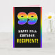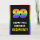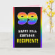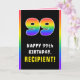 Den här sjudande kortdesignen med pulserande och roligt-födelsedag har ett stort nummer "99" som har ett dynamiskt multifärgat regnbågsspektrum som inspirerar gradienten mönster, tillsammans med meddelandet "LYCKLIG 99 BIRTHDAY", och en redigerbar mottagare av namn. Insidan har ett hälsning-meddelande på anpassningsbarnas födelsedag, eller kan kanske tas bort och lämnas tomt om ett meddelande ska skrivas för hand i stället. Ett sådant här roligt-kort för hälsning på födelsedagskalender i personlig kan vara ett sätt att skicka födelsedagskalendrar till någon som firar sin nittionionde födelsedag. [~Z0000636]