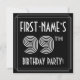 Framsidan av den här snyggten och 1920s-1930-talet inspirerade stil till 99:e födelsedagsfest/firande-inbjudningskortet har en personlig namn, ett finare art deco-utseende inspirerat nummer "99:e", meddelandet "FÖDELSEDAGSFEST!" och ett gräns med flera linjer. Som standard har framsidan också en bakgrund med svart färgad, men den kan anpassas till ett annat färg om så önskas. Baksidan innehåller personlig om händelsen, t.ex. datum, tid, plats/plats och all annan information som kan vara viktig. Snyggt, lyxiga, anpassade inbjudningar som dessa kan användas till gäster från inbjudan till en födelsedagsfest som hålls för att hedra någons 99-årsdag. [~Z0000615]
