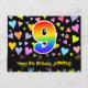 Framsidan av denna roliga och färgglada födelsedagskortdesign har en stor siffra "9" med ett regnbågsspektrum-gradering-mönster. Den har också texten "Grattis på 9-årsdagen," och ett anpassat mottagarnamn. Framsidan har dessutom ett livfullt och färgglatt hjärtformsmönster i bakgrunden. Baksidan har ett anpassat födelsedagsgratulationsmeddelande, eller kan eventuellt lämnas tomt om ett meddelande ska skrivas för hand istället. Ett födelsedagskort som detta kan vara ett roligt sätt att skicka födelsedagsönskningar till någon som firar sin nioårsdag. Postkort som detta kan också användas för att bjuda in gäster till en födelsedagsfest som hålls för någon som fyller 9 år.