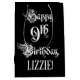 Den här utförliga och formella födelsedagstexten för presentsäcksdesignen innehåller meddelandet "Lycklig 9:e födelsedag" i opulent text stil, på en svart färgad. Det har också en personlig som tar emot namn. En presentpåse som denna kan användas när en gåva eller present ge till heder för någons nionde födelsedag. [~Z0000557]
