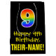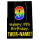 Den här färgstarka, spännande och roligt-födelsedagskalans presentväska har ett stort nummer "9" med en regnbågsspektrumövertoning som inspirerade mönster, tillsammans med meddelandet "Lycklig 9:e födelsedagen" och en anpassningsbar mottagare namn. Bakgrunden är svart på färgad. En dylik presentpåse på födelsedagen kan vara ett roligt sätt att slå ihop en gåva eller present som ges till någon som firar sin nionde födelsedag. [~Z0000512]