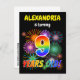 Framsidan av detta spännande och livliga vykort från födelsedagsfest inbjudan har en personlig namn, ett livfullt brinnande berömmande fyrverkerier inspirerade mönster, och meddelandet "9 ÅRS OLD!" med ett färgstarkt regnbågsspektrum inspirerade gradienten mönster. Baksidan innehåller ett personlig med information om party, till exempel när och var det hålls kvar. Bjudkort av detta slag kan skickas till potentiella gäster från ett party som hålls för att fira födelsedagen för någon som blir nio år gammal. [~Z0000452]