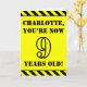 På framsidan av denna uppmärksamhetsjakt och fetstil på födelsedagen med hälsningskort finns en redigerbar namn och meddelandet "DU ÄR NU 9 ÅRS GAMLA!" i svart stencil stil på bakgrunden till färgaden av gulten. Det finns också en svart och gult rand mönster överst och grund kant längst fram i öga. Insidan innehåller ett hälsning-meddelande från personligens födelsedag, eller kan kanske tas bort och lämnas tomt om ett meddelande ska skrivas för hand i stället. Ett sådant här födelsedagskort i personligen kan vara ett roligt för att erkänna någons nionde födelsedag. [~Z0000413]